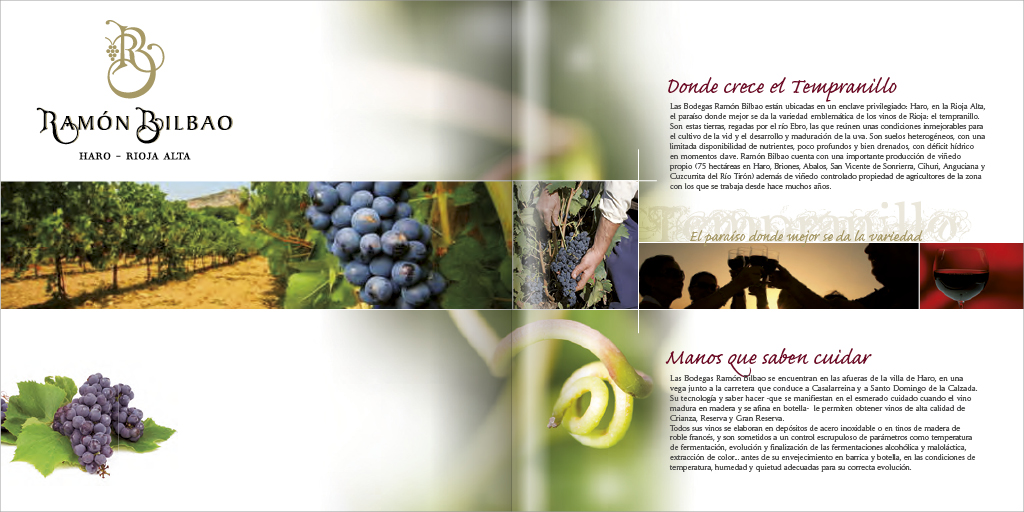 Bodegas Ramón Bilbao PortafoliosCatálogos y folletosBodegas Ramón Bilbao Proyecto: Catálogo de imagen Bodegas Ramón Bilbao . Tareas dentro del proyecto: Dirección de arte, diseño y maquetación. Año 2010 4 Leche Lactel Bodegas Palacio de la Vega Leche Lactel Bodegas Palacio de la Vega Artículos relacionados Newsletter SIGAUSLeer más Pantene KolestintLeer más 2ª Pasarela Reyes CatólicosLeer más